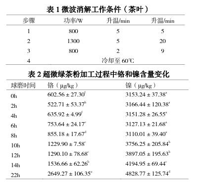 血[6];過(guò)量的鎳可引起炎癥、癌癥、癥、系統(tǒng)紊亂、降低生育能力、致畸和致突變等[7];鉻雖是人體必需的微量元素,但高鉻的食用也會(huì)引起不適[8]。超微綠茶粉是將達(dá)到綠色標(biāo)準(zhǔn)的綠茶茶葉,經(jīng)超微粉碎形成 200 目(74μm)甚至達(dá)到 1000 目(12μm)以上的綠茶超微細(xì)粉[9-10]。現(xiàn)階段我國(guó)企業(yè)大多采用球磨方式加工超微綠茶粉,在球磨加工過(guò)程中,茶葉被粉碎的同時(shí),研磨材料本身也會(huì)發(fā)生變化,從而可能給超微綠茶粉帶來(lái)重金屬污染。另外,與傳統(tǒng)茶葉不同的是,超微綠茶粉屬于茶葉深加工范疇,常被以全組分形式加入到食品和化妝品中[11],又因其中的重金屬元素應(yīng)滿足《食品標(biāo)準(zhǔn)食品中污染物限量》和《茶葉中鉻、鎘、汞、砷及氟化物限量》對(duì)茶葉中重金屬限量要求[12-13],因此應(yīng)對(duì)超微綠茶粉加工過(guò)程中重金屬污染給予關(guān)注,但目前對(duì)超微綠茶粉加工過(guò)程中的重金屬含量變化未見報(bào)道。本文對(duì)球磨加工過(guò)程中超微綠茶粉的重金屬含量進(jìn)行檢測(cè)分析,同時(shí),采用三組球磨材料不銹鋼球-不銹鋼罐、氧化鋯球-不銹鋼罐、瑪瑙球-尼龍罐對(duì)超微綠茶粉進(jìn)行加工,通過(guò)重金屬元素鉻和鎳的檢測(cè),并結(jié)合粒徑分析,為尋找合適的球磨材料提供依據(jù)。