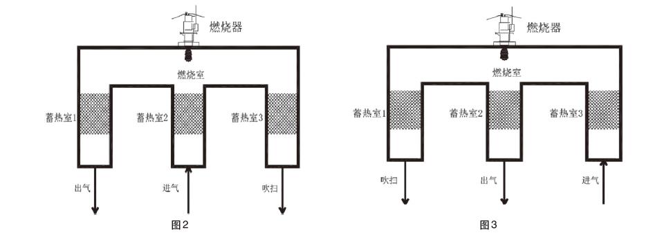 待蓄熱室3里面蓄熱體熱量吸附飽和后,切換閥進(jìn)行切換,如圖2所示。廢氣進(jìn)入蓄熱室3,經(jīng)過(guò)高溫預(yù)熱后,進(jìn)入燃燒室,從蓄熱室2出,熱量為蓄熱室2所吸收,直至蓄熱室2吸附飽和,開(kāi)始切換。如圖3所示進(jìn)入下一個(gè)流程,3次切換為一個(gè),如此運(yùn)行。RTO切換閥切換時(shí)間,一般為60s-120s,切