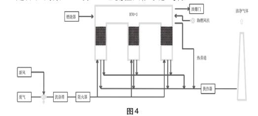 在廢氣處理項(xiàng)目中,3塔RTO一般與風(fēng)機(jī),噴淋塔,阻火器,煙囪等組成一個(gè)系統(tǒng)。RTO一般正壓運(yùn)行,風(fēng)機(jī)應(yīng)選擇變頻控制適應(yīng)不同工況。前置噴淋塔可吸收酸、堿性廢氣,減少對(duì)RTO爐的腐蝕。后置噴淋塔可進(jìn)一步降低廢氣排放量。有的有熱回收需求,可在末端增設(shè)熱交換器,產(chǎn)生熱水和熱氣回用。煙囪可根據(jù)項(xiàng)目需要設(shè)計(jì),一般至少為15米高,煙囪越高對(duì)廢氣擴(kuò)散有利,成本也越高。系統(tǒng)的組成需要根據(jù)項(xiàng)目來(lái)設(shè)定,圖4為某RTO項(xiàng)目工藝流程圖(供參考)。