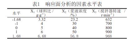 影響球磨機(jī)超微粉碎效果的主要因素有球料比、攪拌器轉(zhuǎn)速、枸杞子渣漿液濃度和粉碎介質(zhì)。因此本研究以上述3個(gè)因素作為試驗(yàn)因素,固定球磨介質(zhì)為Φ10mm氧化鋯球,在單因素試驗(yàn)的基礎(chǔ)上,通過(guò)響應(yīng)面分析化佳工藝參數(shù),以粉碎后的顆粒粒度d50作為超微粉碎評(píng)價(jià)效果。