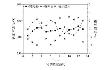 在連續(xù)監(jiān)測穩(wěn)定運(yùn)行階段多個切換周期后,將燃燒室三個熱電偶及變送器監(jiān)測的爐膛溫度值計(jì)算得到平均值,同時將每個蓄熱室中的出口位置熱電偶的溫度值進(jìn)行記錄,圖2為同一測點(diǎn)的工程實(shí)際數(shù)據(jù)與數(shù)值模擬值的對比。通過對比,得到溫度模擬數(shù)據(jù)與實(shí)際監(jiān)測值的相對誤差均在4%以內(nèi),這也可能是RTO裝置的切換閥因閥板和閥座密封性很難保證、氧化爐爐膛上部的防爆裝置存在泄漏,以及溫度監(jiān)測設(shè)備的精確度不夠等問題造成的。因此,燃燒室和蓄熱室溫度測點(diǎn)監(jiān)測值的平均值和模擬值相對誤差滿足數(shù)值模型準(zhǔn)確性的要求,所以此數(shù)值模型可以較好的反應(yīng)RTO裝置在正常運(yùn)行階段的溫度變化情況。